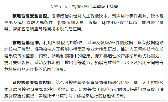 (六)人工智能+核电。围绕核电安全发展,构建核电安全预警、电站运行事件智能溯源分析、应急响应的智能辅助支持系统,开展核工业特种运维机器人技术攻关,持续推动核电系统的自动启停等技术升级演进,探索人工智能技术助力离子体预测控制、可控核聚变等技术路径,推动核电行业向数据驱动、模型牵引、智能管控的新模式稳步转型。