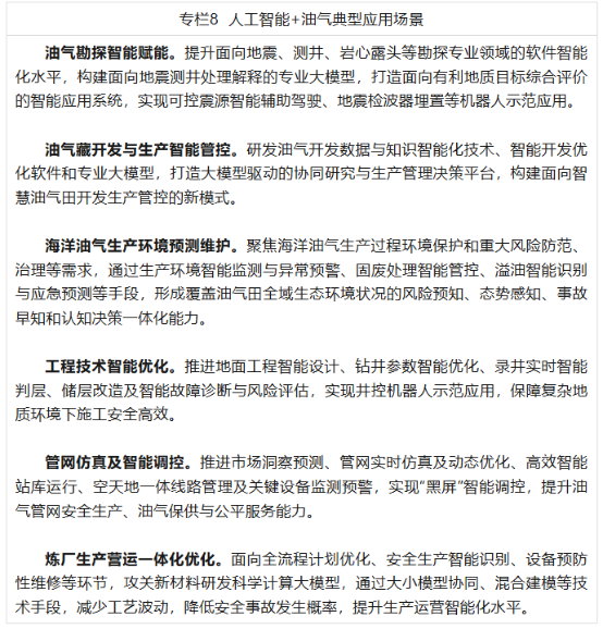 (八)人工智能+油气。聚焦跨专业协同研究、现场作业操控、生产运行管控等方向,推动勘探地质目标智能评价、开发方案智能优化、钻井压裂等作业参数智能调整、炼化装置智能运行、管网运行实时仿真,加快智能钻机、机器人、无人机、智能感知系统等智能生产技术装备的研发与应用,推动生产现场等全过程智能联动与自动优化,推动油气产业链智能化升级建设。