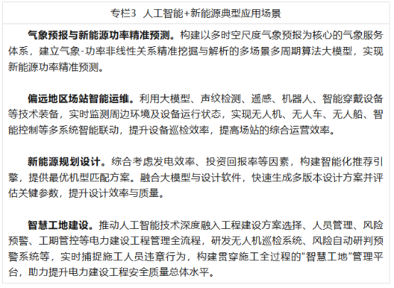 (三)人工智能+新能源。针对新能源出力波动性与间歇性的问题,加快在高精度功率预测、电力市场、场站智慧运营、新能源规划、项目后评价等方向的人工智能应用,持续推动新能源关键材料及产品不断迭代和创新,推动复杂场景及转折性天气下功率预测大模型在更小尺度、更高精准度方向发展,支撑广域新能源资源协同优化,促进偏远地区新能源场站智能运维发展,打造“气象预测+功率预测+智慧交易+智能运维”一体化新能源智能生产模式,全力支撑新能源稳定供给。